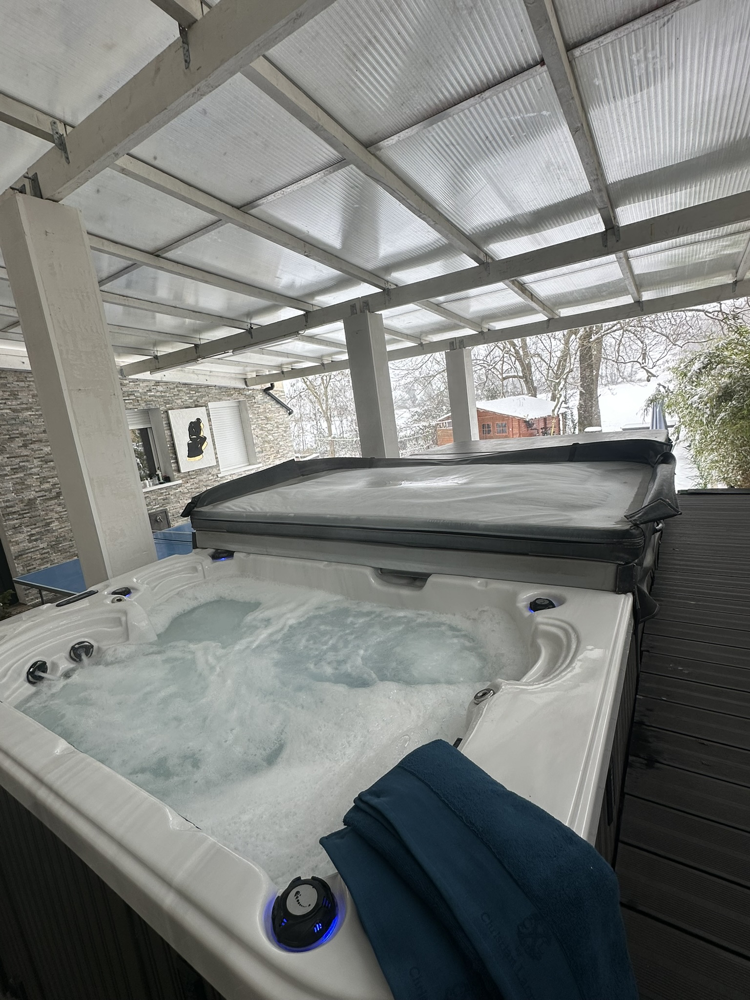 Plongez dans notre jacuzzi 3 places et laissez-vous porter par la douceur de l'eau chaude et la puissance des jets massants. Un moment de pure relaxation qui détend les muscles et apaise l'esprit.